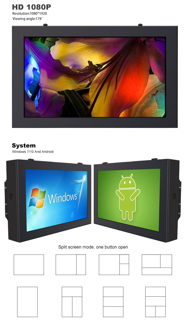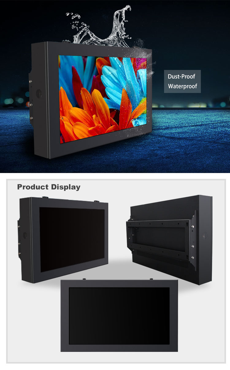 Our outdoor LCD displays are engineered to operate in temperatures from -25°C to 55°C with IP65/IP66 weatherproof rating. They feature reinforced enclosures, anti-corrosion coatings, and advanced thermal management systems to ensure reliable performance in rain, snow, dust, and extreme temperatures.